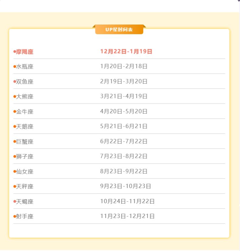 *摩羯座up星上线后,天秤座、天蝎座、射手座及它们的星座伴生鱼可在时之星愿中祈愿获得;