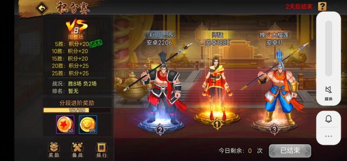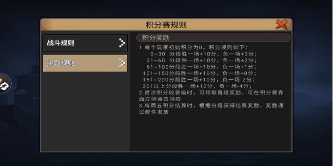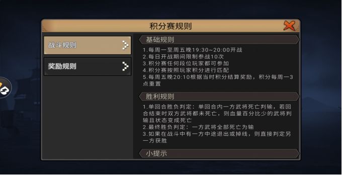 活动周期改为每周开启,周期为7天(周一~周日),每周一至周五晚19:30~20:00开战,饭后的甜蜜娱乐时间,半个小时畅玩十局,刚刚好。每周一0点重置,比赛日每日限制参与10次,总赛程累积50次。成为锻炼武将单兵作战能力的演武场!同时新增的胜场额外加分和分段晋级奖励,综合性奖励增加不少,活跃度明显提升了很多。 2.积分赛积分奖励