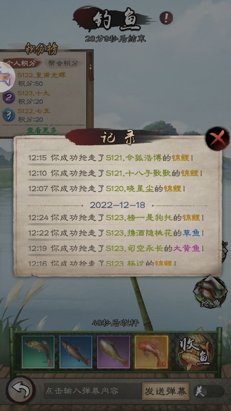 钓鱼如果在战力跟上中等水平以上而且掌握了技巧的话我认为是一天中最有意思的活动(没什么比抢锦鲤更有盼头,靠钓就算了..),有些战力太低划水的玩家由于难以抢更多的人确实会觉得有些浪费人生。活动中钓到的鱼可以兑换成经脉丹和突破丹,最稀有的锦鲤一条888元宝。每场活动一共有6次机会可以抢夺其他人的鱼,打不过抢夺失败也不会扣次数。抢锦鲤的技巧核心就是眼疾手快,同时战力足够不至于谁都打不过,由于钓到锦鲤的人会发送全服公告消息,一般也都是过一阵子同时几个人一起的钓到,所以看到消息就进入抢夺界面速度刷新到有锦鲤的人抢就完事,有时刷的时候就可能遇到有人有锦鲤,别人公告还没发出来,你先抢到都很正常,很多人不一定会守着去收鱼,认真去抢不存在抢不到一条的,天道酬勤嘛。另外本身抢夺界面刷新的4个可抢的人也可以理解为他们在帮你钓锦鲤,有时候不刷,记记名字,等公告出来不要犹豫直接抢,抢鱼同时也稍微注意一下收自己鱼就行。楼主本人这个活动经常前三以及第一,一个中午抢2、3条锦鲤都是习以为常,最高的一次抢4条自己钓到1条,一个活动就将近5000元宝了,收益不要太高。