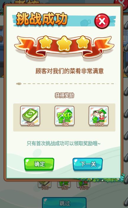 看到了考核成功后丰富的奖励了吗?宣传和考核两种赚钱和刷经验的方式相辅相成可以让店铺运营的更快,还有,在宣传的途中可能会遇到BOSS哦?有机会与BOSS拼比厨艺来获得新菜品的技能和经验,如下图。