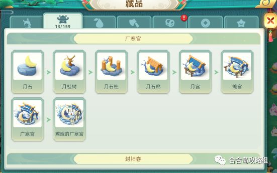 但大家合成的东西越来越多的时候,在这中间是可以解锁很多不同的奖励的,就比如合成五个比较小的广寒宫就能解锁的比较大的嫦娥广寒宫了,在这个大宫殿中有很多宝贝等着大家发现的,玩家可以自由在里面探索发现并收集宝贝。