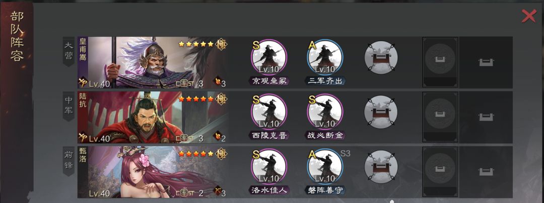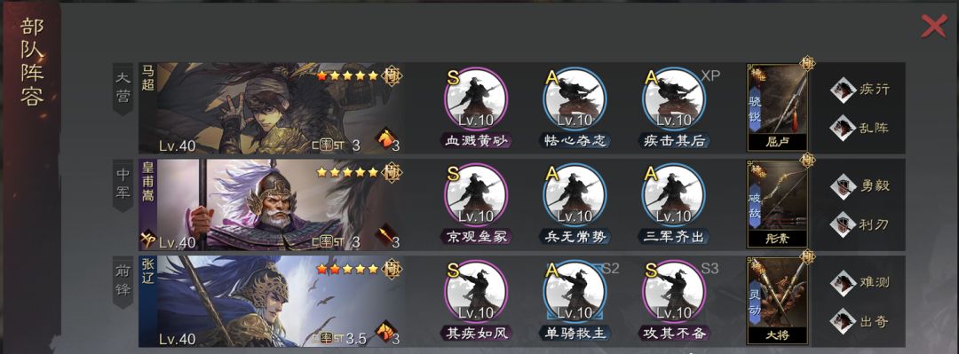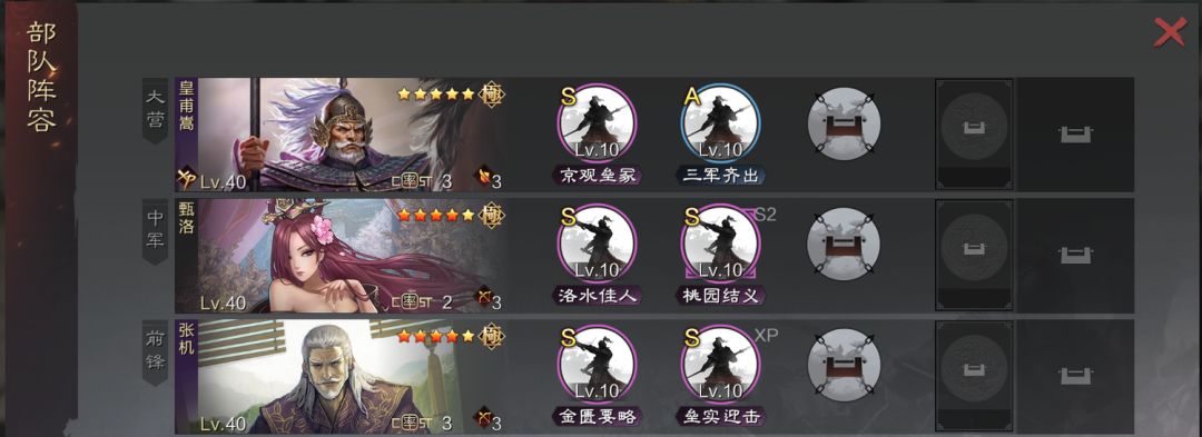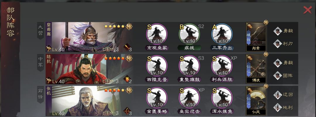 步步这里,如果张机和陆抗红,就用步步,桃园金匮前期,步步重整后期,如果是张机比较白,那就兵无、无心、反间这些都可以,现在垒实健卒系列的打狗刀还是很舒服的,很多人会把皇甫嵩调成攻击和谋略第一,不过我觉得这队皇甫嵩还是正常加点好,顶多就是张机追点速度防吕蒙就可以了,为了西陵克晋的一段伤害,把整队属性都搞了有点不值得。