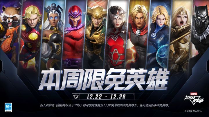 2022.12.22(周四),5v5战场中本周可免费使用的英雄将更替为:宇宙术士亚当、蒂娜、万磁王、洛基、伊卡洛斯、黑豹、希芙女士、隐形女侠、暴风女、火箭浣熊。请各位观察者积极参与战斗。
