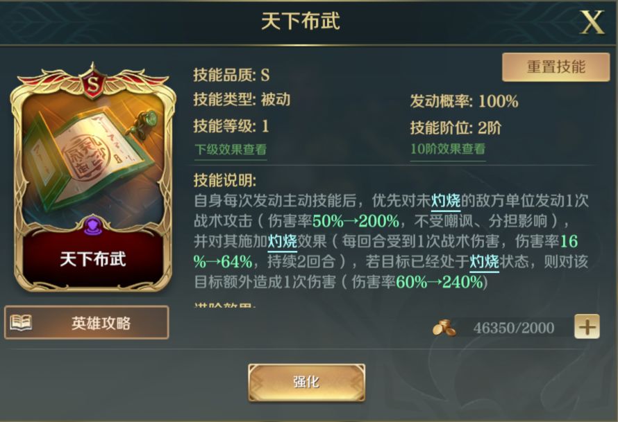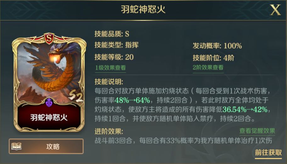 非常契合主动队的A级军略技能之一,除了能够提高我方2人主动技能释放几率,还能够使敌方伤害最高的英雄前两次伤害降低一定比例,很大程度上弥补了织田信长和酒馆嬴政携带的主动技能释放几率较低的不足,同时配合【羽蛇神怒火】也能有效地抑制敌方输出。