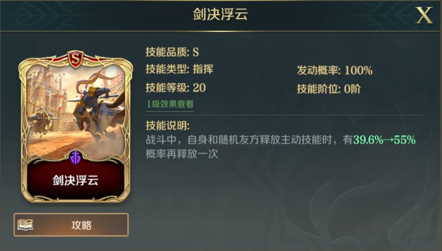 S3赛季T0技能,自带力量、智力增益属性,同时单体伤害系数高,若对方处于负面状态,则能够额外触发一次。配合【剑决浮云】能够在短时间内打出爆发伤害,是本套阵容中无可替代的技能。缺点是释放几率较低,需要部分军略技能进行弥补。