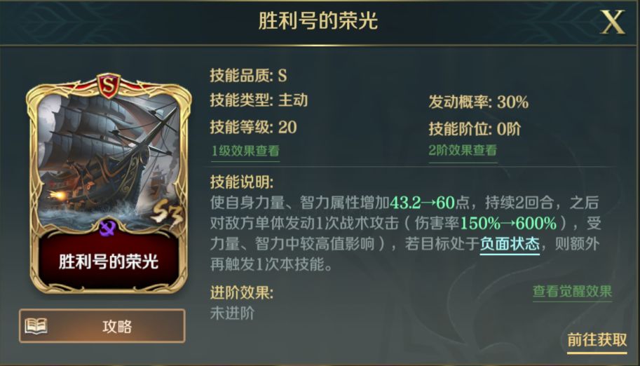 使自身和随机友方英雄在释放主动技能时,概率再释放一次。该技能适合搭配一些高伤害系数或者属性增益类的主动技能,例如【胜利号的荣光】、【复仇女王号】等,有着非常高的契合度。