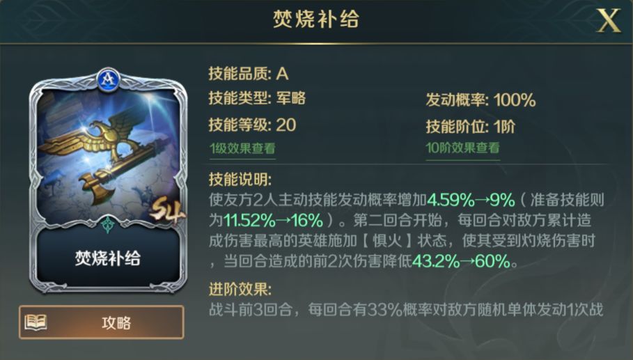 稳定对敌方单体施加灼烧状态,同时当满足全体灼烧条件时,能够大幅度降低敌方主将的输出能力,与【焚烧补给】可以形成很好的技能联动,从而进一步保证队伍的生存能力,非常契合本套阵容。