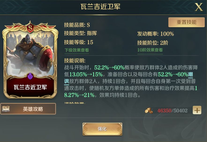 游戏内非常好用的嘲讽技能之一,每回合可以高几率嘲讽敌方2名英雄,为队友吸收伤害,保护C位输出,并且提供增伤效果,可以说是集攻防于一体的指挥技能。