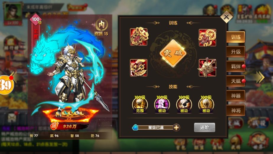 在游戏中,玩家通过建设城池,资源争夺,比武竞技等玩法获取各种材料和资源,用以培养武将,获取坐骑,锻造装备等来提升自己的战斗力,最终与其他玩家一起在三国的战场上获得成就。通过游戏,培养了玩家积极进取和团队协作的精神。
