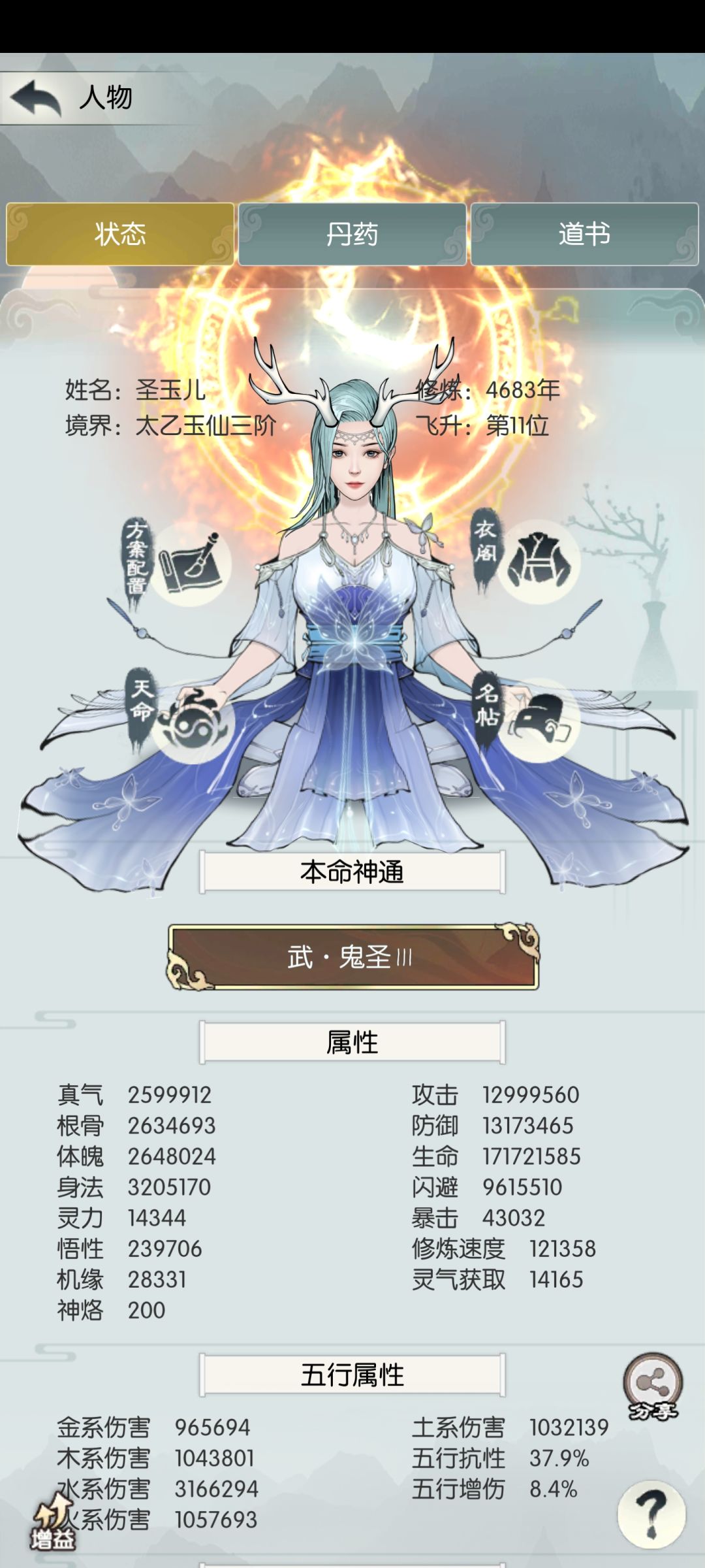 五行在飞升前基本没有提升,所以招式不要带五转圣功,但是你要选择一种(除了土)作为你的主五行,不要想着保持平均去同时提升几种。
