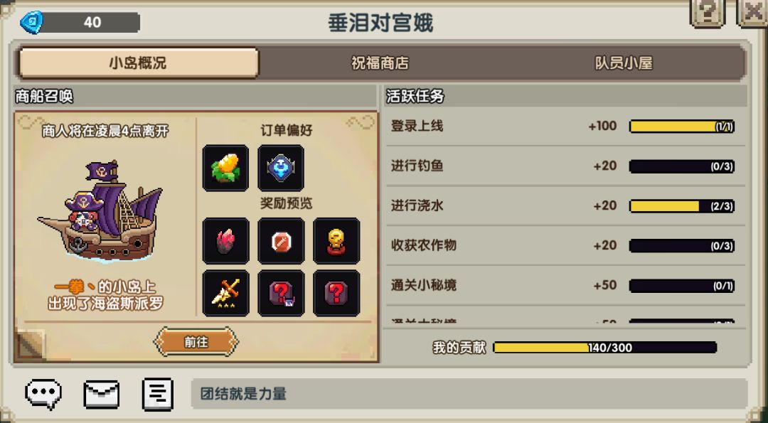 如果每天队伍的活跃度足够的话,在每天10点会召唤一艘商船来到小队成员中随机一个的岛屿边上,这里以可以完成任务获得奖励,在凌晨4点的时候商船会离开