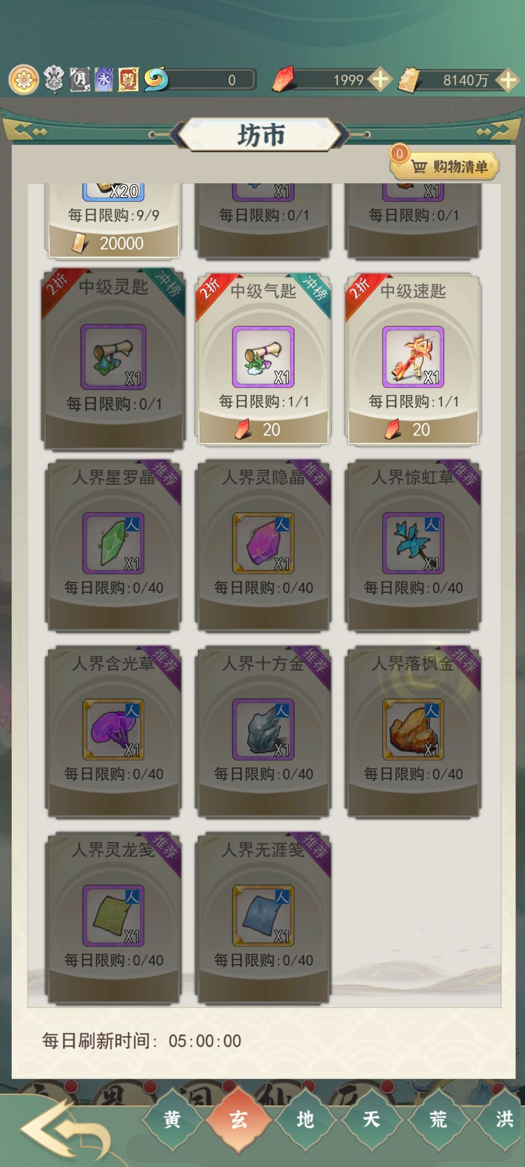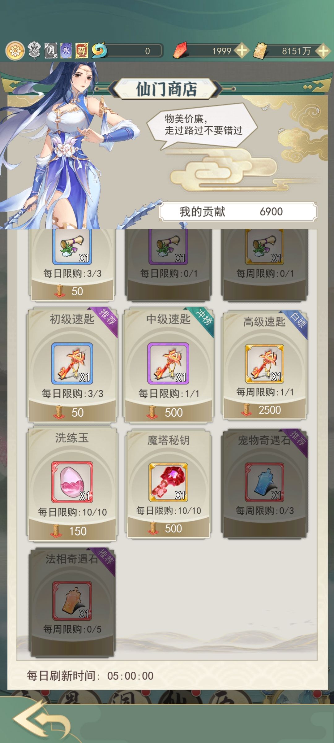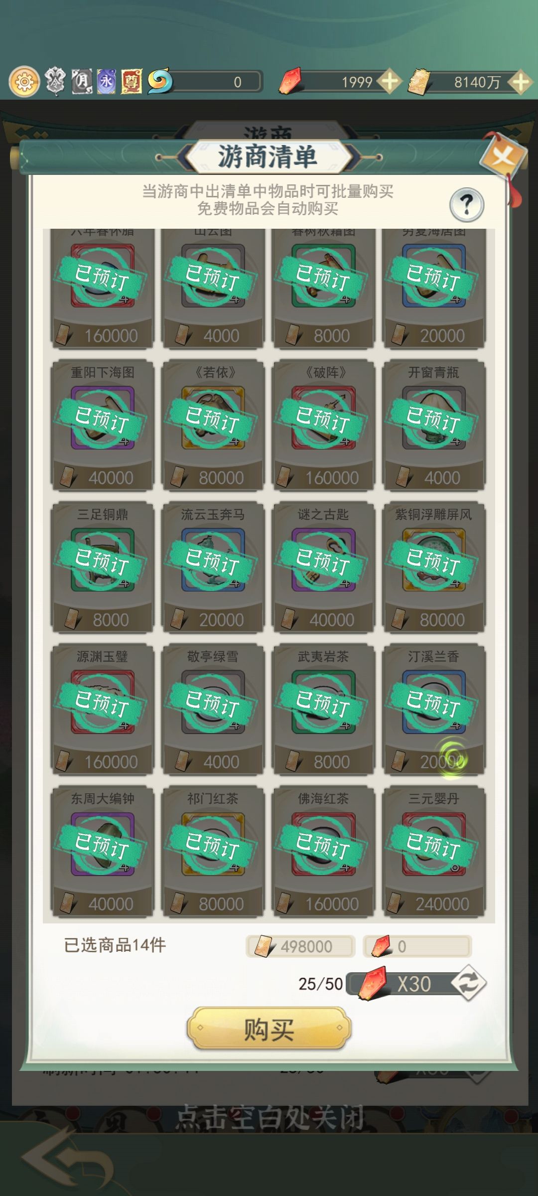 再就是游商的购买,游商我们把好感度礼物都加购了,剩下一些用灵石买的玉髓,三元婴丹这种我会根据需求在购买界面买,毕竟灵石后面还是有大用的,这个游商一天能刷50次,但是我们仙玉有限不能刷这么多,看情况刷把我很佛系每天都不等。
