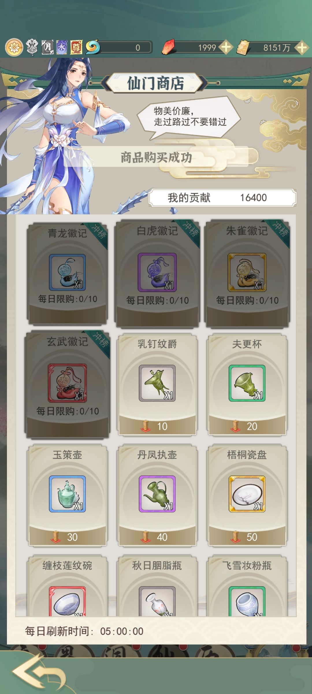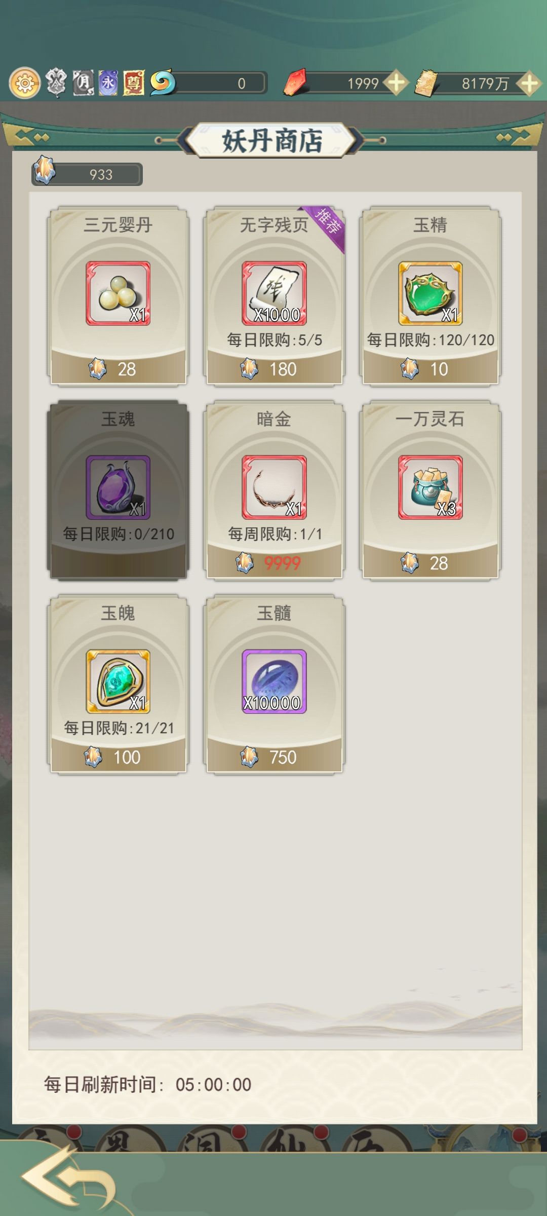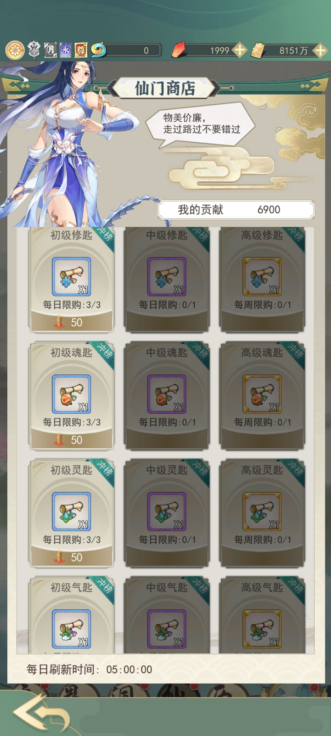 再就是游商的购买,游商我们把好感度礼物都加购了,剩下一些用灵石买的玉髓,三元婴丹这种我会根据需求在购买界面买,毕竟灵石后面还是有大用的,这个游商一天能刷50次,但是我们仙玉有限不能刷这么多,看情况刷把我很佛系每天都不等。