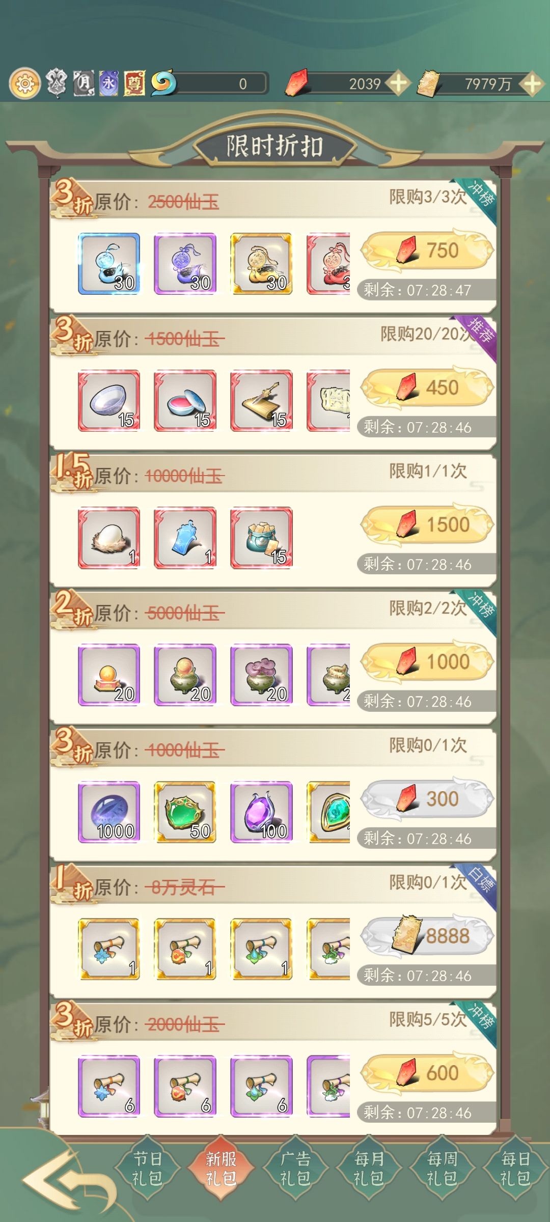 礼包码全换了之后,大概给了1w多仙玉和好多道具,我们继续跟着主线走,把洞府界面里面能升级的建筑都可以无脑升级了先,尤其是今雪堂。等我们来到人界的时候,可以点小老虎拉礼包了,这里拉礼包,做为白嫖微氪,小老虎里面写冲榜的我们一律不看,写白嫖的无脑买,剩下的我们买一些性价比高的礼包就行,比如月礼包里面的2折宠物抽奖和法相抽奖,新服礼包里面300玉的玉魄玉魂礼包,还有称号礼包可以无脑买买买