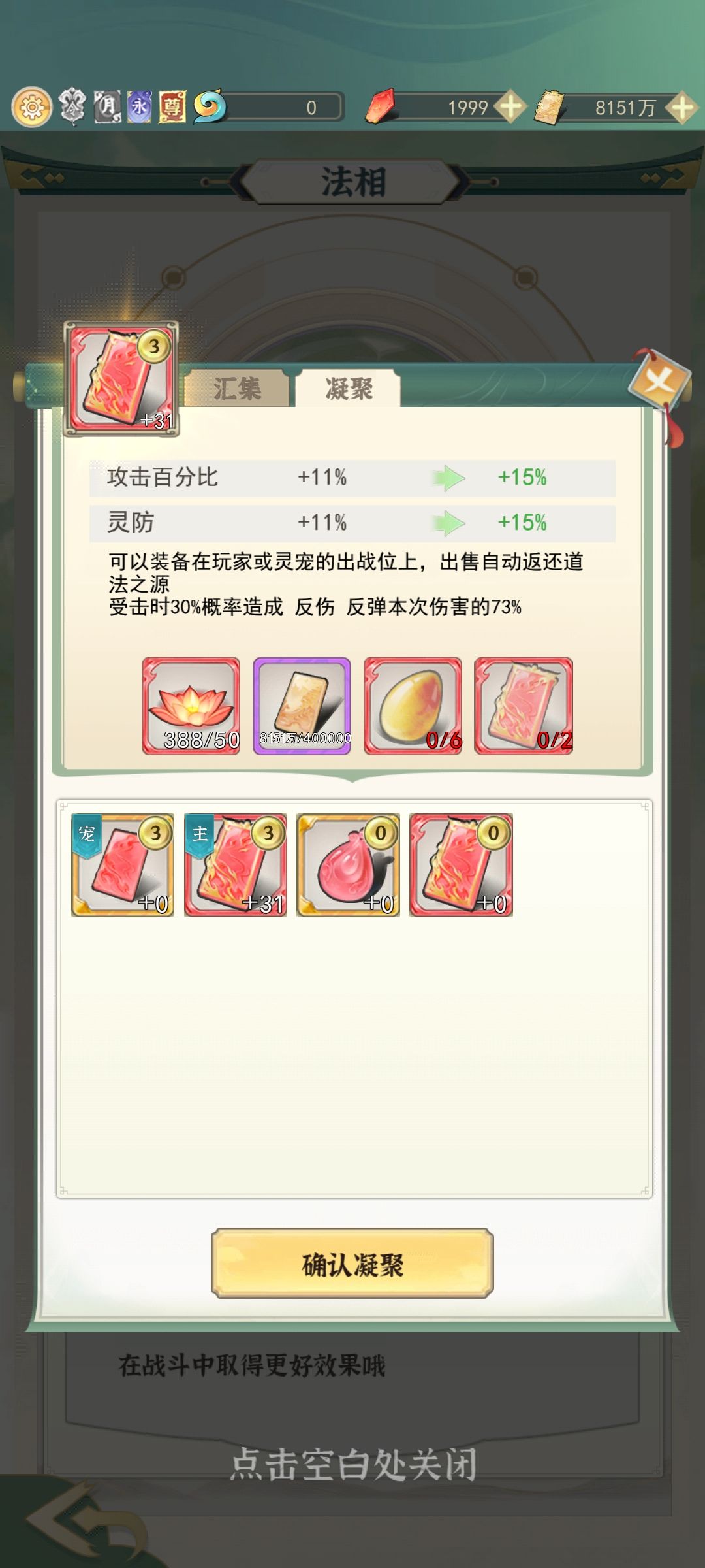 然后是法相,法相要化神大圆满开启,没开启之前小老虎礼包里面是看不见法相抽奖券的,法相一般人物带红的宠物带橙色,都红色资源不够分配,然后人物带重土紫薇,宠物带重土天市或者重土太微,比较白嫖微氪,重土可以被打几率反击,越战好手脸好无限可能,其他的法相我们都可以分解了用作汇集和凝聚的材料