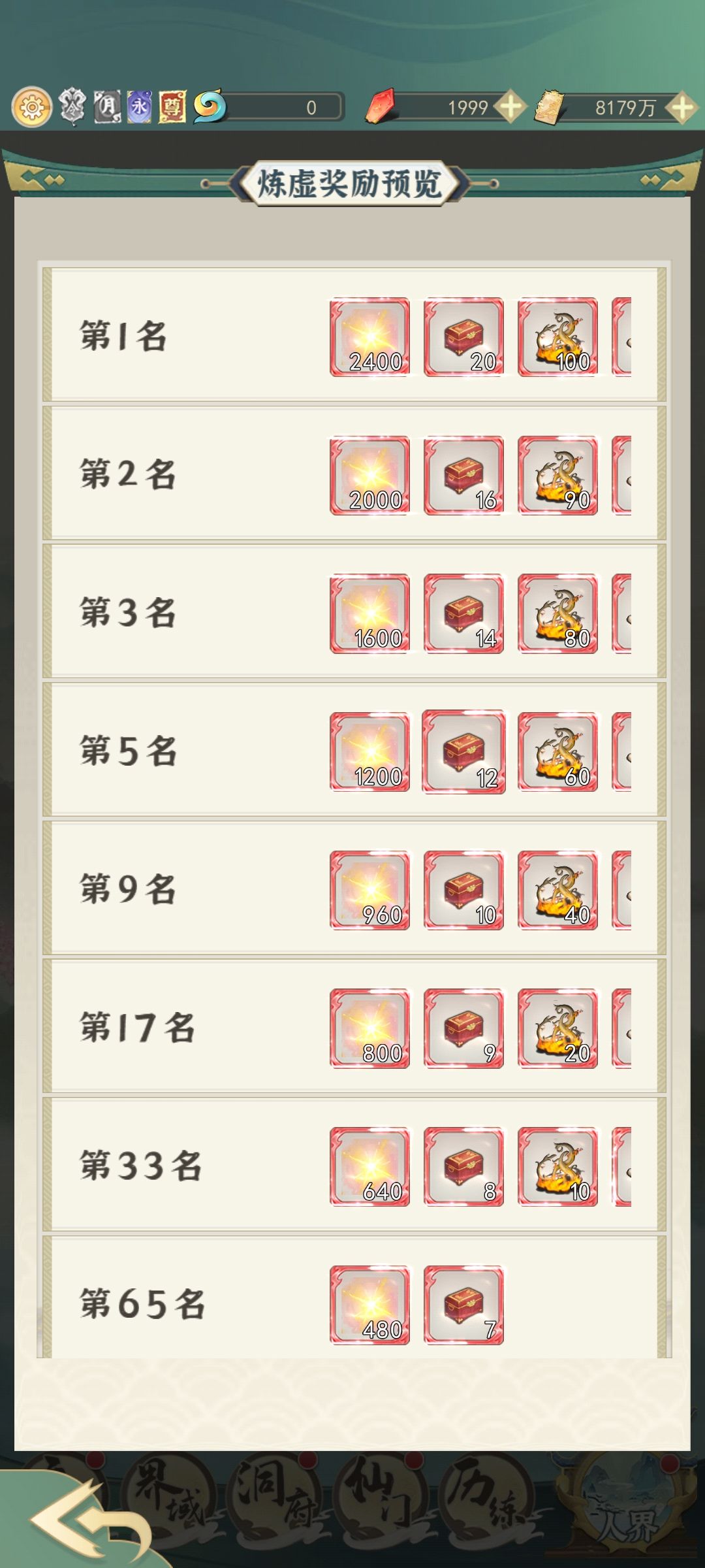 再就是关于斗法,这个奖励非常多。但是排名差异也很大,斗法是分境界的,每个境界奖励方面除了荣誉点不一样,其他奖励都是一样的