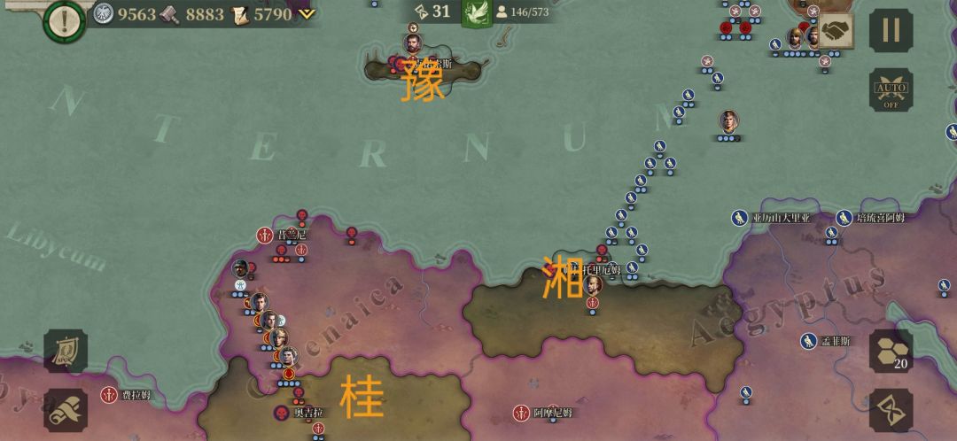破釜沉舟,只攻城不打祭坛,在小亚细亚局势马上就要崩的情况下12个回合灭了阿喀琉斯。随后贝利弓指克拉苏去东南打火龙,汉朝匈奴也很给力,打的就剩两座城了,战车出来了,感觉汉将快撑不住的时候。我出去给韩信换了加行动力和无视地形的装备,以闪电战的方式灭掉战车。屋大维和秦俑救下罗马城转战叙拉古。就是巴尔干半岛太难,就庞培和霍去病,没有弓将,只能去换血,无奈招了德弓勉强拿下巴尔干。