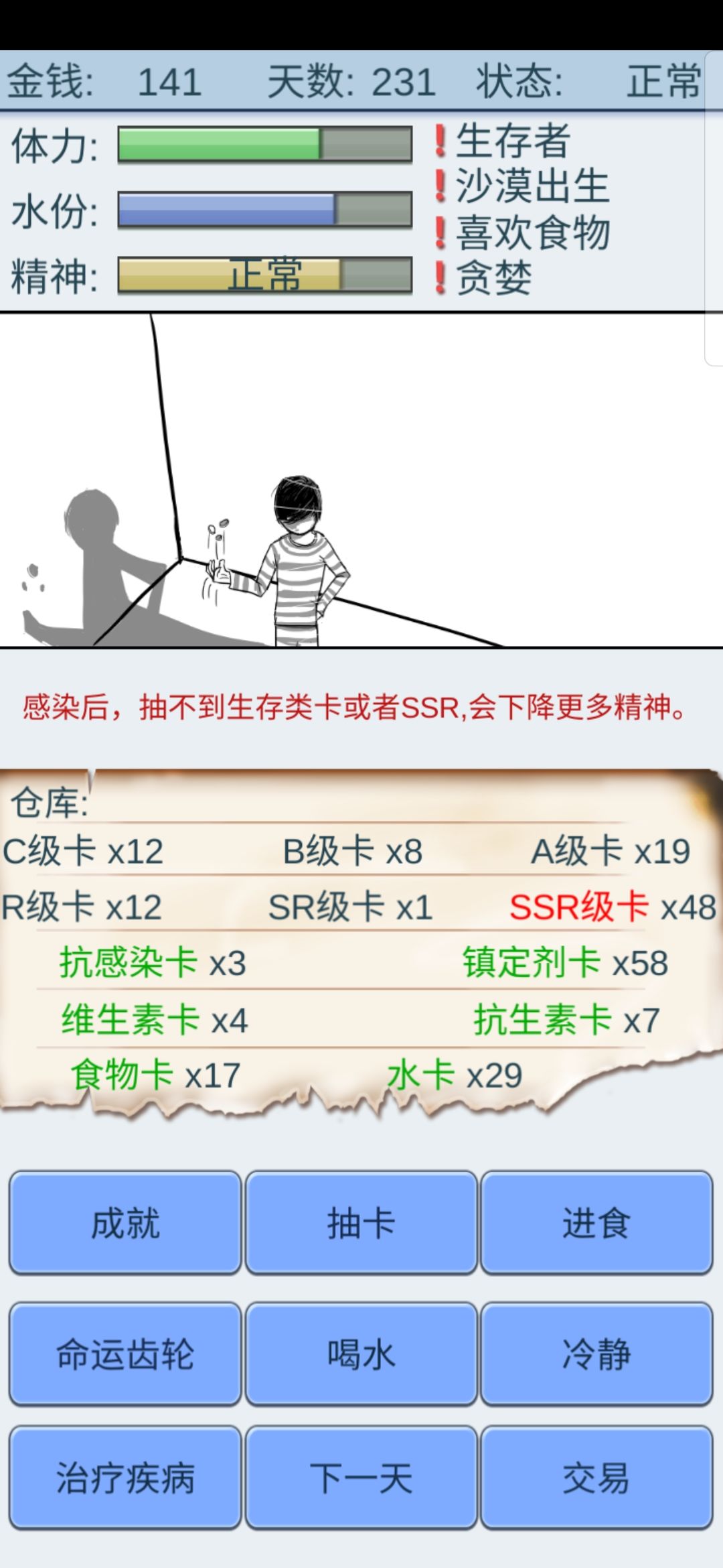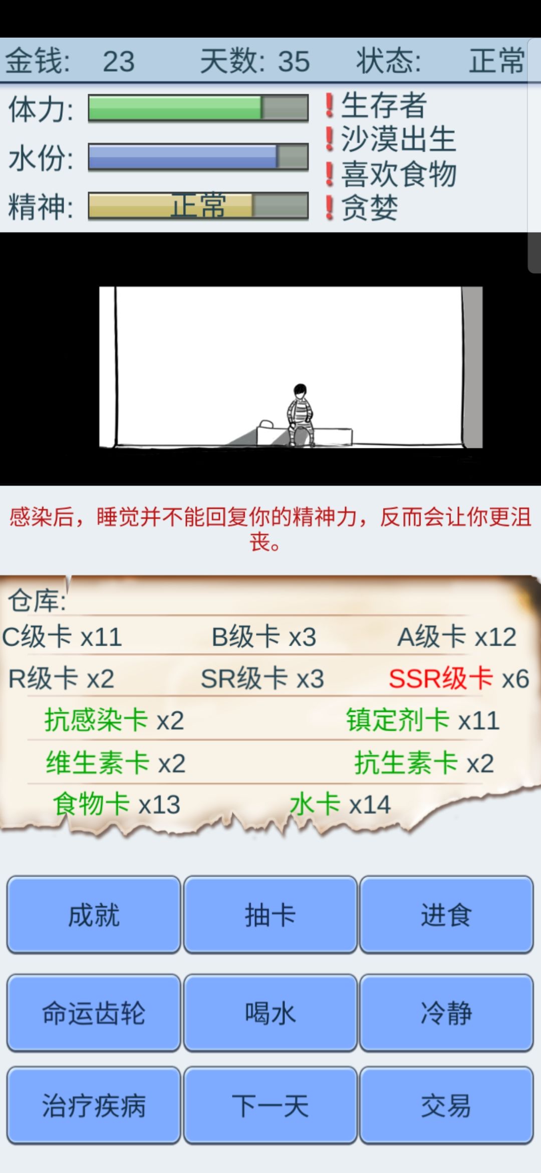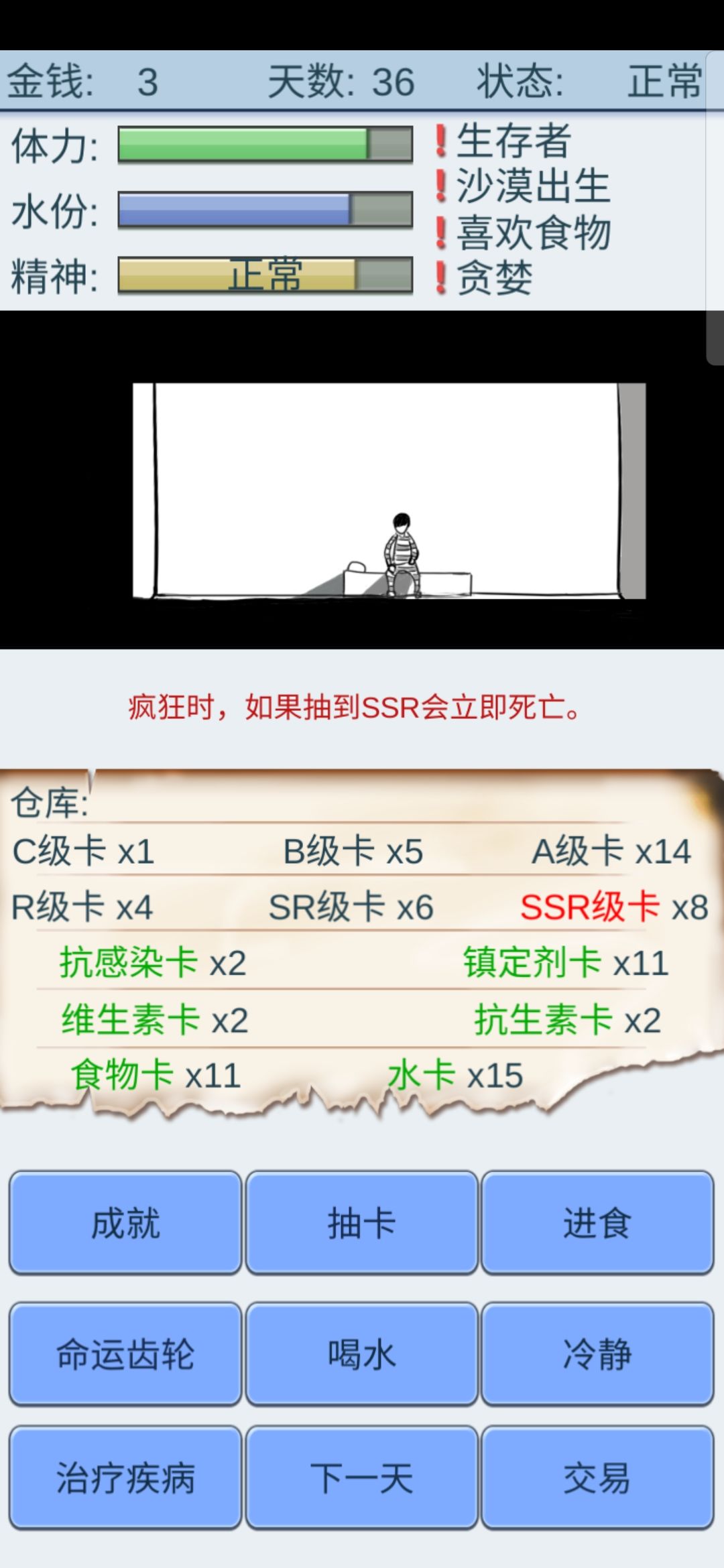 沙漠出生:抽到水卡几率减少,但消耗水也减少(注意平时多买点水卡,结果现在我的水卡比食物卡还多)