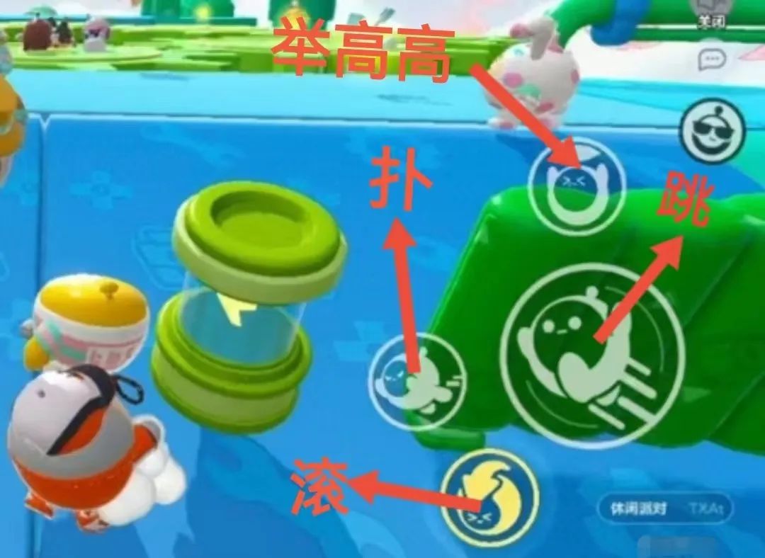 在蛋仔派对的游戏中,蛋仔可以看到操作按钮中,左边是前进方向的调整,右边是跳扑举高高,还有滚。