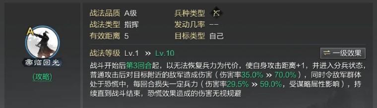 帝临回光是一个复杂的复合型指挥战法,包含以下效果。