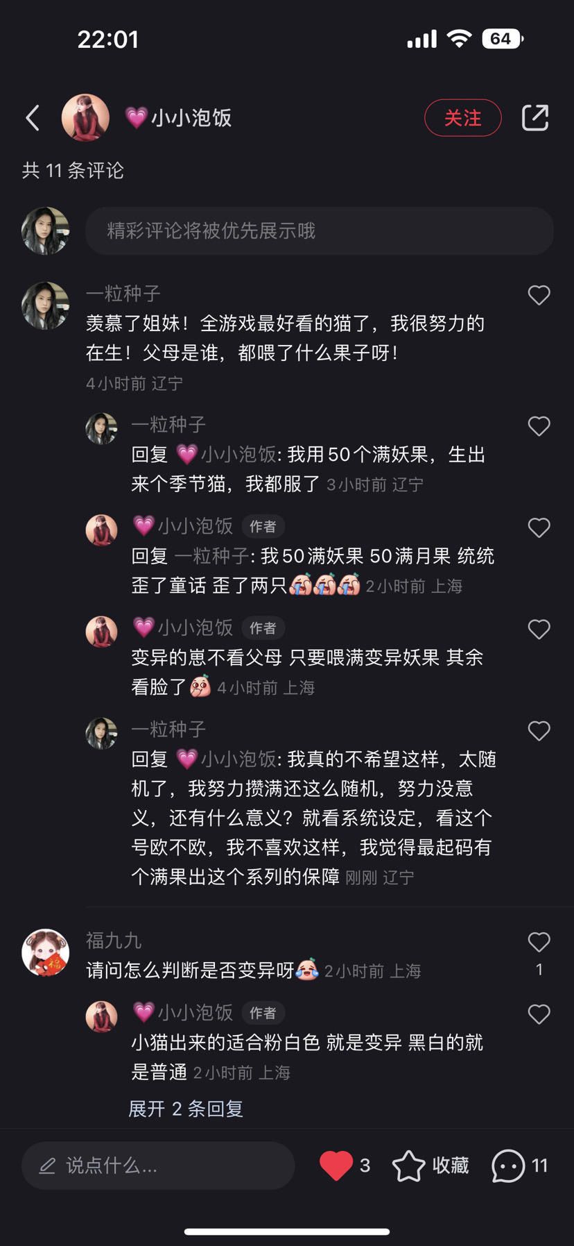 2.我也在小红书和群里微博上,看到无数例一点好果子不放,全普通果子,或者双方都只放一两个好果,双方都有变异猫,属性比我群友放满生的还好。