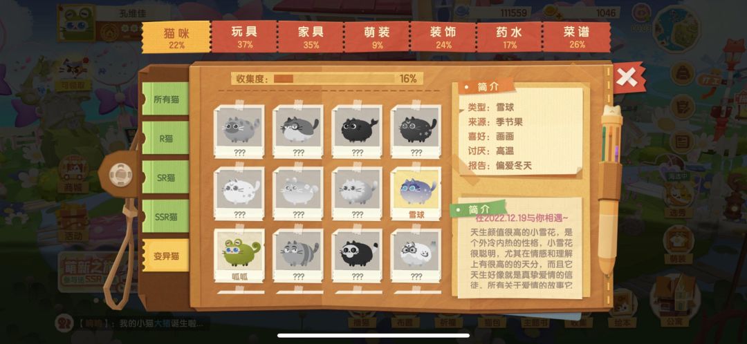 5. 因为两个人凑满100个同一种果子很不容易,我觉得这个难度足够给个这个系列任意一只保底了,现在很多人生不出来这个系列的,都是用非常容易的季节猫打发了,就雪球这个季节猫,简直人手一只了!!变异猫大概率都是这个!随手一刷满屏别人一个果子就生出来妖系了,就很可笑,这也不是奖池,玩家选择父母,果子,连生出来的属性,系列都没个规律,全靠运气,这真受不了,这不是我们玩游戏了,是游戏玩我们了,很多人也反应别的问题了,我就主要反应这个吧!继续往下翻!有我的变异心得!!