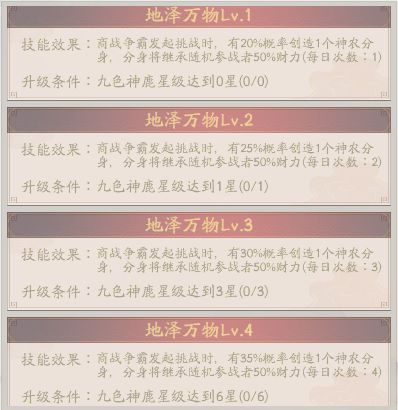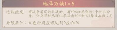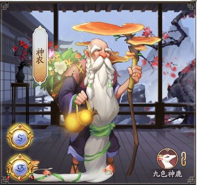 神农的珍兽是九色神鹿 ,他有特殊的触发技能,每一级都是有详细介绍的,普通技能这里就不一一介绍了都是增加财力的没有触发效果。