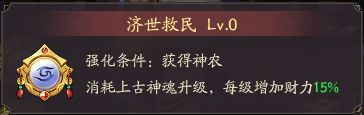 济世救民,获得神农之后就会激活,没升一级就会增加百分之15的财力升级是需要消耗上古神魂升级的。