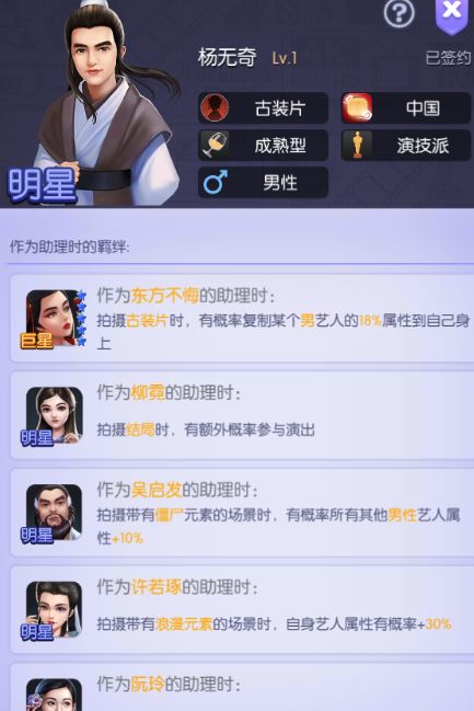 明星级艺人可谓是艺人中的中流砥柱,不仅可以上阵拍电影,也可以下场当助理,自身拥有3个技能与各不相同的擅长角色与剧本,加上明星合同较为容易获得,建议培养您的擅长片类型的明星