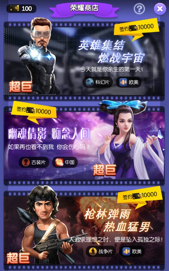 目前版本超巨只有3个,分别是战争片、古装片、科幻片类型,每一个都是能大幅度增加所拍摄后的电影质量,可谓是核心中的核心,目前只能通过“黑金荣耀卡”进行兑换,兑换获得后的超巨是满技能(3个技能全5级)的