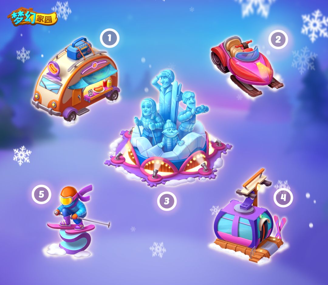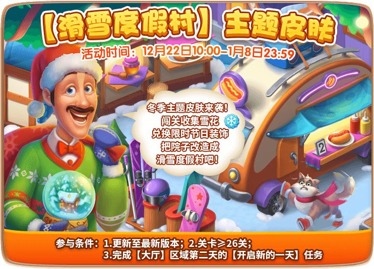 活动玩法:小主人们通过闯关完成任务,收集代币,即可兑换皮肤,把院子改造成滑雪度假村!同时活动期间周末通关还可获得翻倍皮肤代币