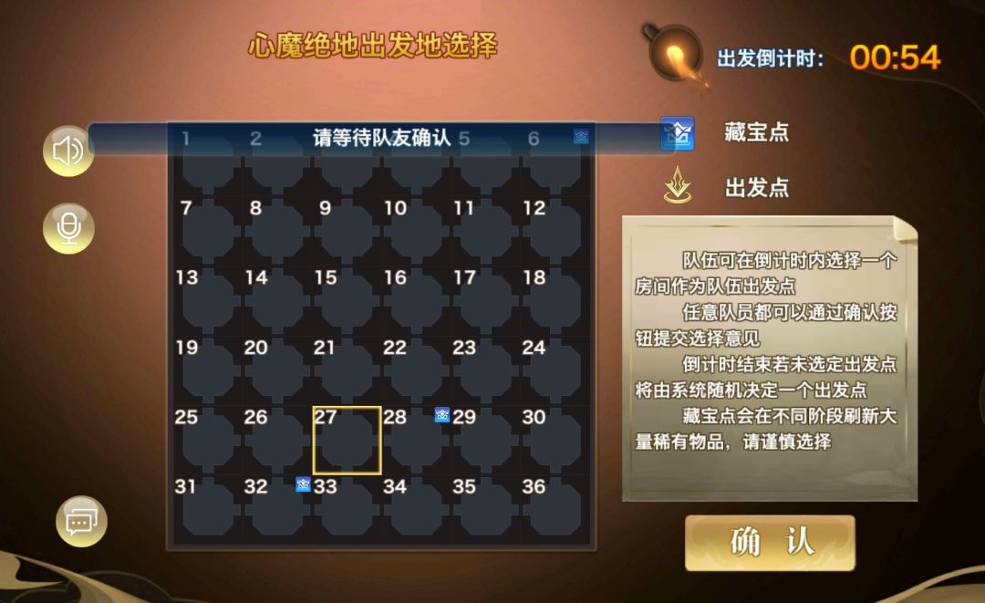 出发地选择的界面就是进去以后的地图,一共有36个房间,其中随机有三个房间是藏宝点。所谓宝,顾名思义就是物资,藏宝点会在不同阶段刷新大量珍稀物资(高级装备、复活石),当然也是要看脸的。出于藏宝点的特殊,这里就可以直接开启队内语音,讨论一下选哪一个房间作为出发点。选择出发点不分队长还是队友,每个人都可以发起请求。