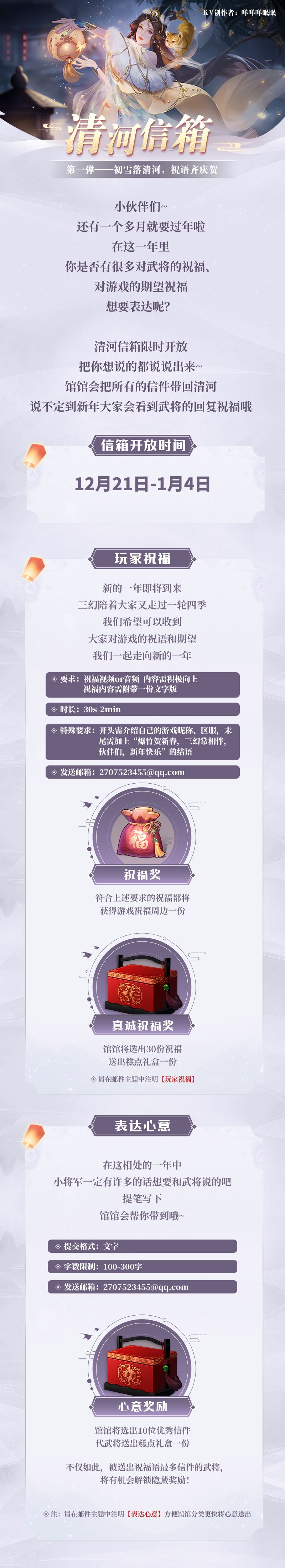 小将军们可以把对游戏或者是对武将的新年祝福,发到信箱中,关关会把大家祝福一一送到清河郡哦