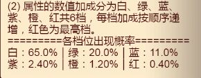 咱们先来看看概率,洗出橙的概率只有1.20%,红更是只有0.40%,这代表着你拿着4W—5W的白玉去找个想要的红属性,除非欧皇,大部分玩家都只是会无功而返,或者出一些废属性,刷出想要的属性很需要运气。