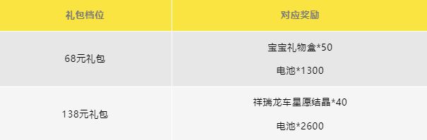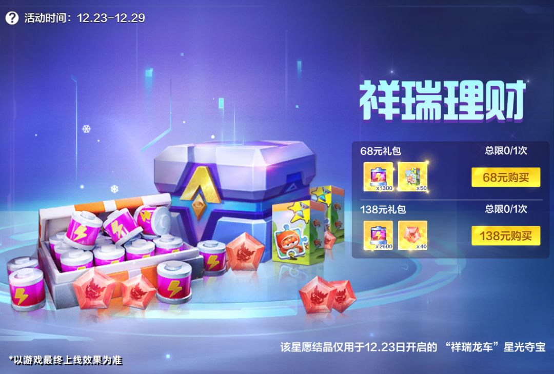 12月23日-12月29日,福利站将限时开启【祥瑞理财】活动,活动期间可直购两档超值礼包,支付成功后可立即获得不同档位电池、宝宝礼物盒、祥瑞龙车星愿结晶礼包奖励。直购金额自动计入V积分,并支持激活招财猫和进宝猫。