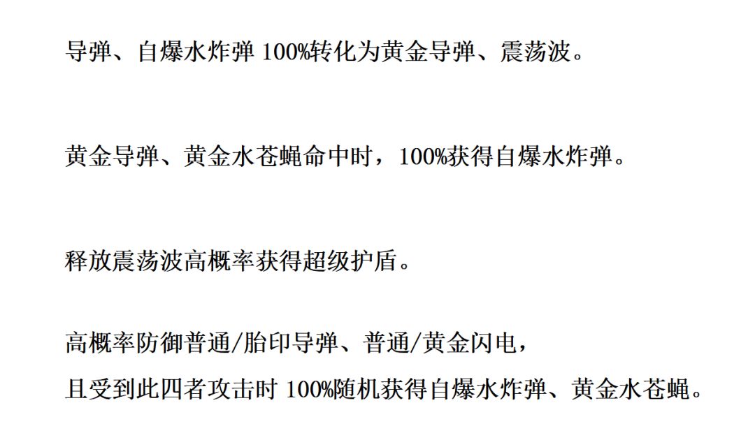 高概率防御普通/胎印导弹、普通/黄金闪电,且受到此四者攻击时100%随机获得自爆水炸弹、黄金水苍蝇。
