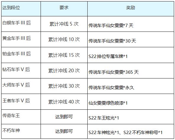 本赛季奖励包含:限时及永久传说车手-仙女雯雯、S22排位专属车牌、仙女雯雯绿色喷漆,更有专属车王的炫光和车神定制炫光及称号喔~