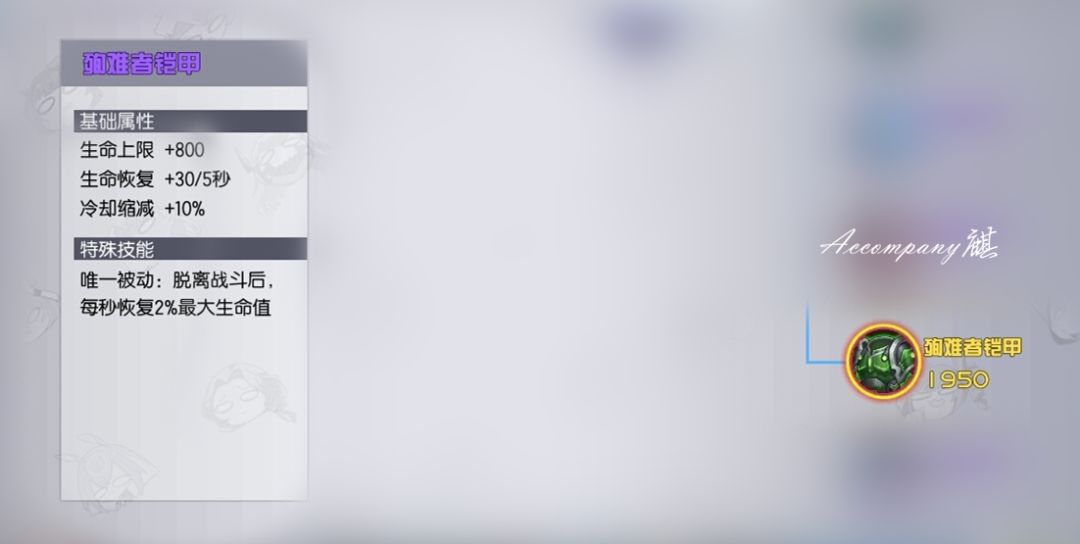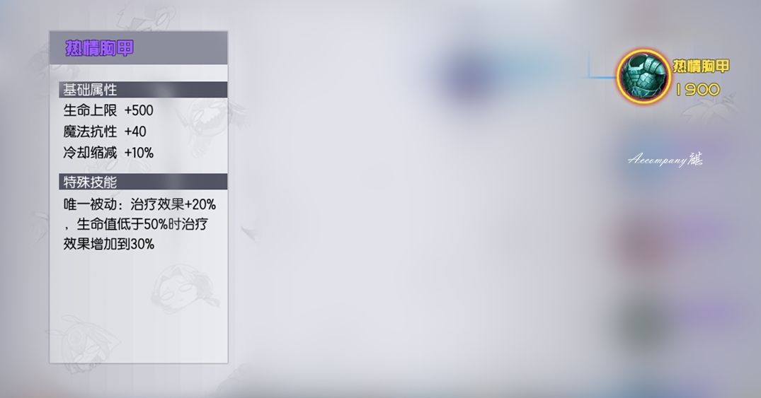 推荐原因:不错的性价比,10的CD缩减,对治疗的增幅效果使得拿治疗技能的软辅可以有更好的治疗效果(当然,仅限出了热情胸甲的队友)