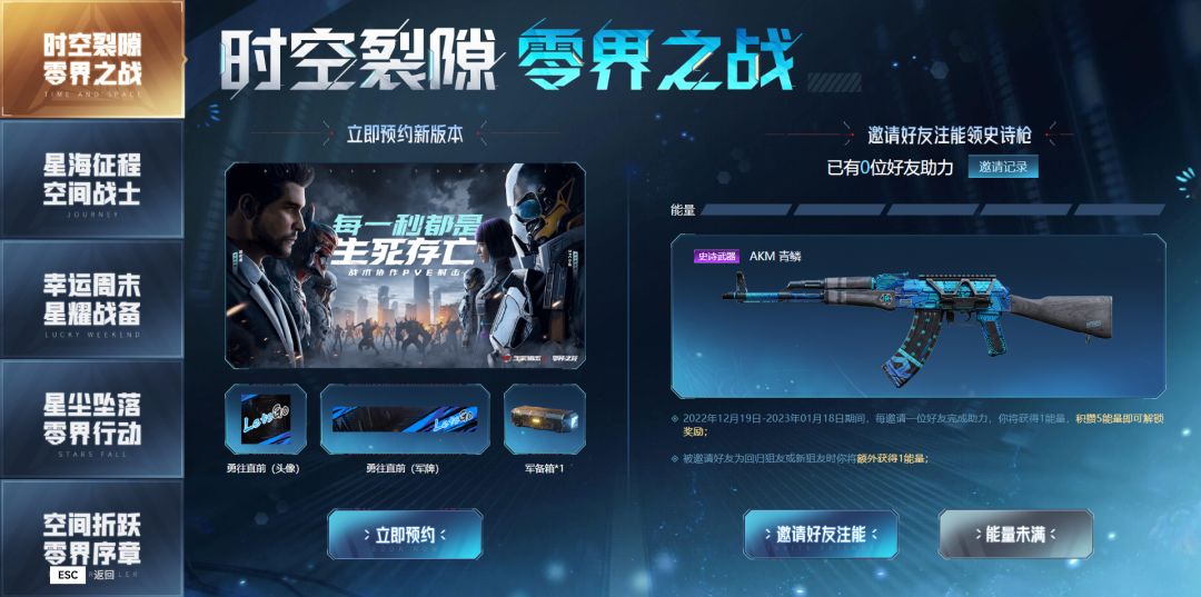 ◊ 时空裂隙 零界之战:预约新版本可领军备箱及勇往直前头像、军牌。邀请5位好友注能可获得史诗武器:AKM 青鳞。