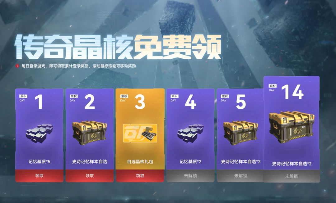 ◊ 传奇晶核免费领:活动期间,累积登录指定天数(无法补签),可领取指定奖励;签到第3天和第7天可领取自选传奇晶核