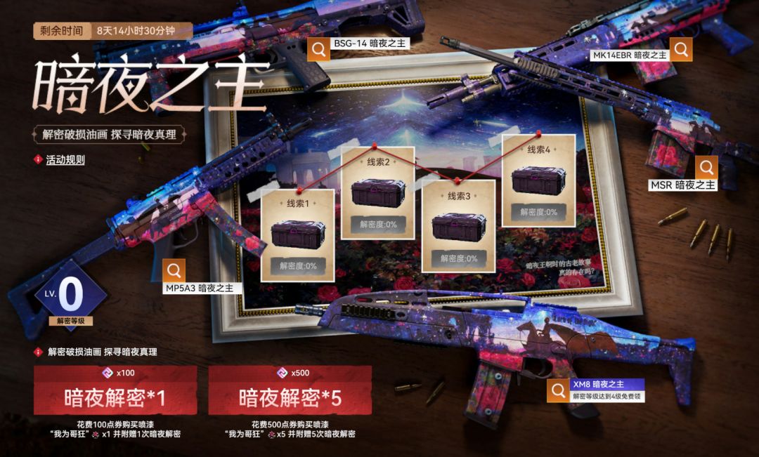 玩家可花费500点券,购买喷漆“我为哥狂”×5并附赠:随机货币×5+暗夜解密×5 2.每次解密可获得不同的解密进度和解密等级