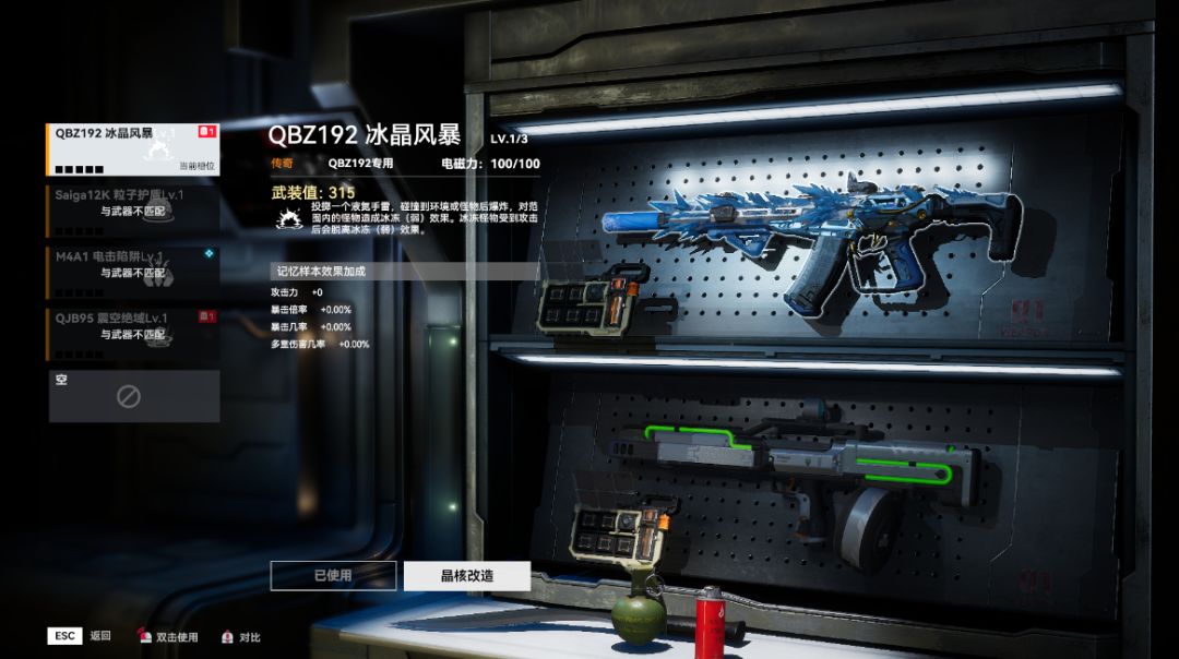 【冰晶风暴】 适配武器:QBZ192 释放技能投掷一个液氮手雷,碰撞到环境或怪物后爆炸,对范围内的怪物造成冰冻效果。