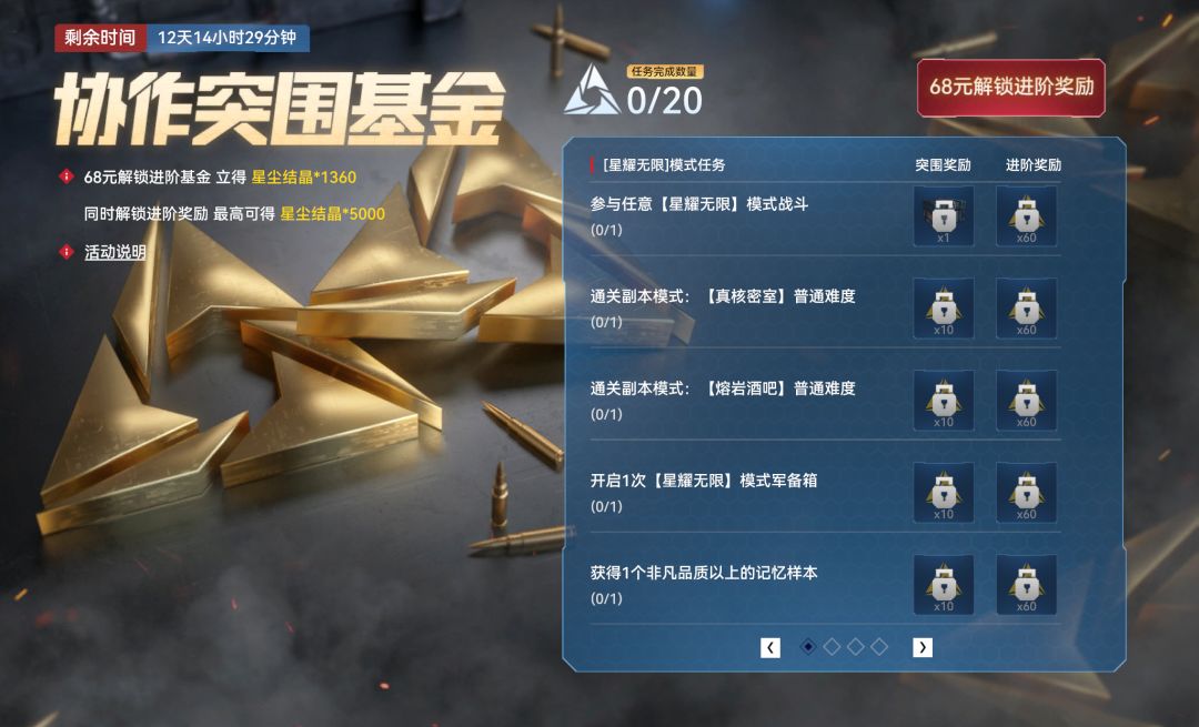 ◊ 协作突围基金:1.完成突围任务,可免费领突围奖励 2.花费68元解锁进阶基金后,可立得星尘结晶*1360,同时也可领取已完成任务对应的进阶奖励