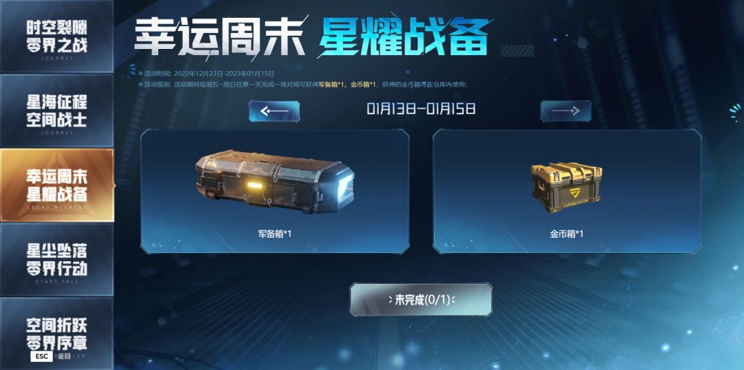 ◊幸运周末 星耀战备:活动期间每周五至周日任意一天完成一场对局,可获得军备箱×1及金币箱×1,获得的金币箱可在仓库内使用。