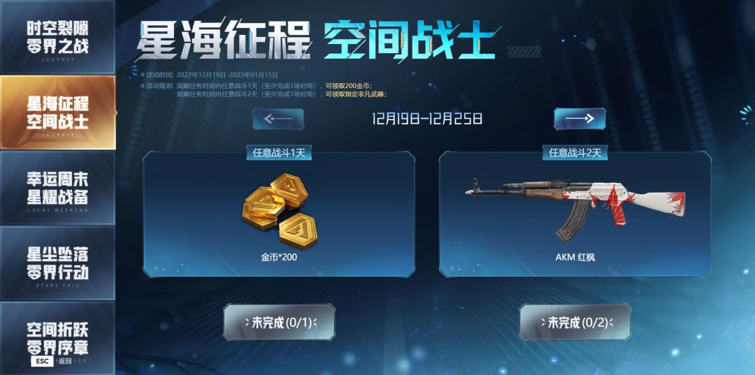 ◊星海征程 空间战士:2022年12月19日起至2023年1月15日,周期任务时间内任意战斗1天(至少完成1场对局),可领取200金币;周期任务时间内任意战斗2天(至少完成1场对局),可领取当周的指定非凡武器。 后续三周的奖励依次为:MSR-圣诞 MK14EBR-圣诞 UMP45-圣诞