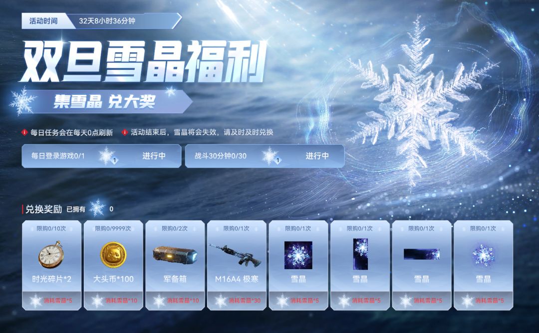 ◊双旦雪晶福利:通过活动任务积攒雪晶,兑换货币道具、军备箱、「M16A4-极寒」等商品。