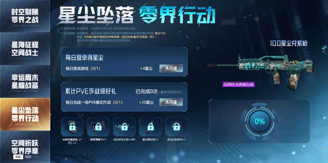 ◊星尘坠落 零界行动:2022年12月22日起至2023年1月15日,每日完成一局PVE战斗即可领取战斗补给并获得星尘*20,集满100星尘即可锻造史诗级别武器。