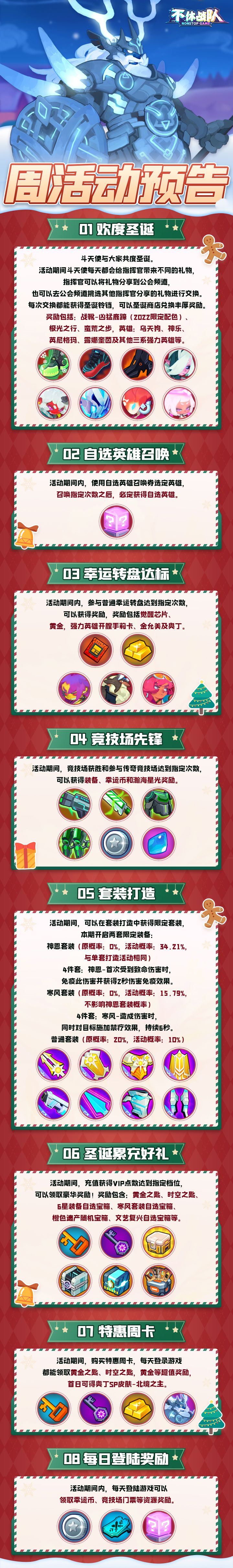 ①欢度圣诞:斗天使与大家共度圣诞。活动期间斗天使每天都会给指挥官带来不同的礼物,指挥官可以将礼物分享到公会频道,也可以去公会频道挑选其他指挥官分享的礼物进行交换。每次交换都能获得圣诞铃铛,可以圣诞商店兑换丰厚奖励。奖励包括:战靴-凶猛鹿蹄(2022限定配色)、极光之行、蛮荒之步,英雄:乌天狗、神乐、英尼格玛、露娜奎茵及其他三系强力英雄等。