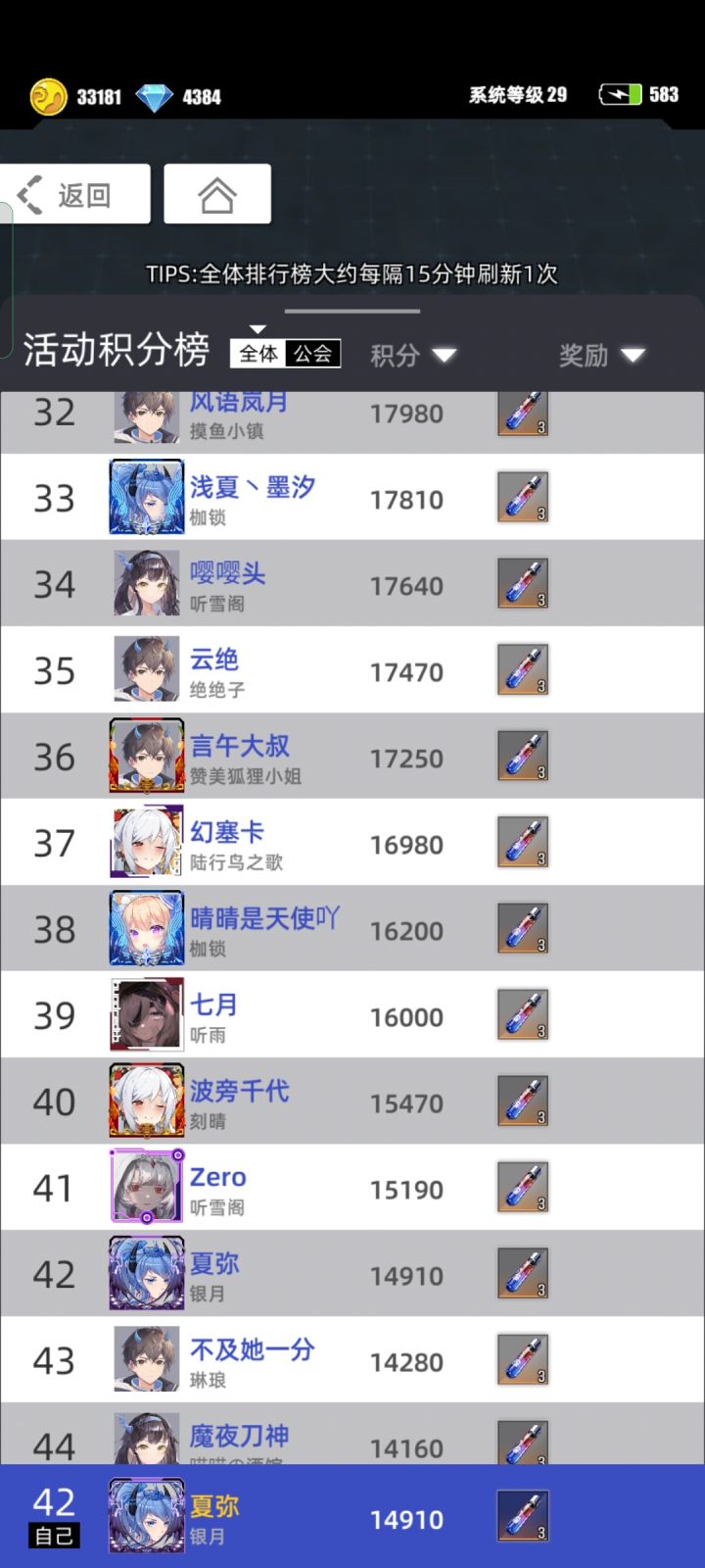 今天六张票,我硬生生打了九十层(五十层左右重启),中间失误了几次,不然还能更多排名从七八十进到前五十了 (*^▽^*) ,用的是芙里娅,几套下来发现这个适合低层,优先四消,技能顺序是2134,菲琳挺惨的,既要给队友套盾,自己又得当盾,礼包我开了五个(常规冲榜操作)徽章带了生命和光厄,天赋的话,因为我药剂之前攒了不少,恰好这四个都有回生命值的天赋,我就都开了,天赋我开了1312能加不少生命值,自动挡至少前三十多层没啥问题,到了四十层就要小心点了,关卡没票的话打有西斯的,西斯厄转火简直是白送能量,核心就是让芙里娅不减血的情况下多放技能,五十关左右就得放四回了,不建议在买礼包数不够的情况下打到六七十层甚至更往上,太浪费跃迁指令了,有更好的配队建议的欢迎来讨论哦(∗ᵒ̶̶̷̀ω˂̶́∗)੭₎₎̊₊♡