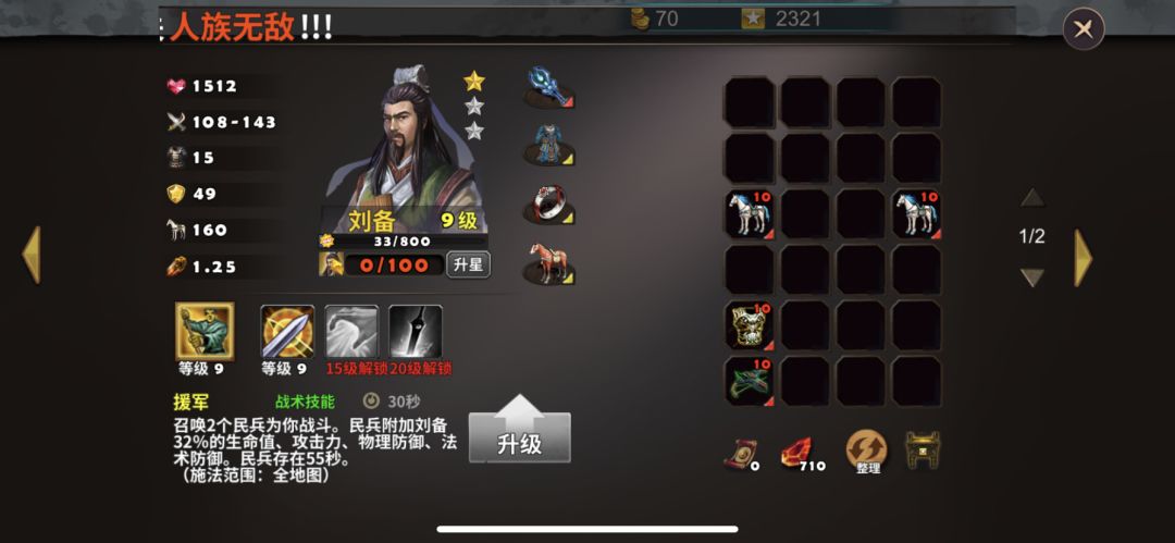 英雄选择刘备、关羽,防御塔使用寒冰塔、天雷塔,战术卡使用练兵、破敌、术塔精通。刘备、关羽装备如图所示。